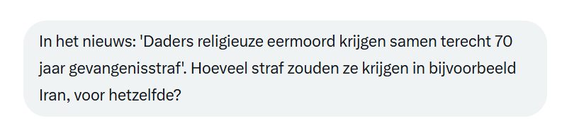 ‘In de praktijk gaan daders van eermoorden in Iran vaak vrijuit of krijgen ze zeer lichte straffen (soms maanden of een paar jaar), wat bijdraagt aan het hoge aantal gevallen (schattingen: honderden per jaar, vaak ondergerapporteerd). Dit contrasteert sterk met Nederland, waar zulke motieven juist strafverzwarend werken.Bronnen als Amnesty International, Human Rights Watch, The Lancet en Iraanse mensenrechtenorganisaties bevestigen deze lacunes in de wet, die eermoorden indirect aanmoedigen door gebrek aan afschrikking. In Nederland wordt een religieuze eermoord (of eergerelateerde moord) behandeld als moord of doodslag, wat vaak leidt tot zware straffen zoals lange gevangenisstraffen (in het genoemde nieuwsbericht samen 70 jaar voor meerdere daders). Dit benadrukt de ernst van voorbedachte rade en het motief. In Iran geldt een heel ander systeem, gebaseerd op de Islamitische Strafwet (Islamic Penal Code) en sharia-principes. Eermoorden (honor killings) worden vaak milder bestraft of zelfs gerechtvaardigd door specifieke wetten:Als een vader (of grootvader van vaderskant) zijn dochter of kleindochter doodt, is hij vrijgesteld van qisas (vergeldingsdoodstraf). Hij krijgt maximaal 3 tot 10 jaar gevangenisstraf (vaak minder in de praktijk), plus mogelijke boete of discretionaire straf (Artikel 301 en gerelateerde bepalingen). Als een echtgenoot zijn vrouw (en eventueel haar minnaar) doodt bij betrapping op overspel, kan hij volledig vrijuit gaan (Artikel 630). Voor andere familieleden (zoals broers) geldt normaal qisas (doodstraf mogelijk), maar in eergerelateerde gevallen leiden familiebanden, maatschappelijke druk of classificatie als ‘familieruzie’ vaak tot mildere straffen, korting of vrijspraak. Rechters houden soms rekening met ‘eervolle motieven’.