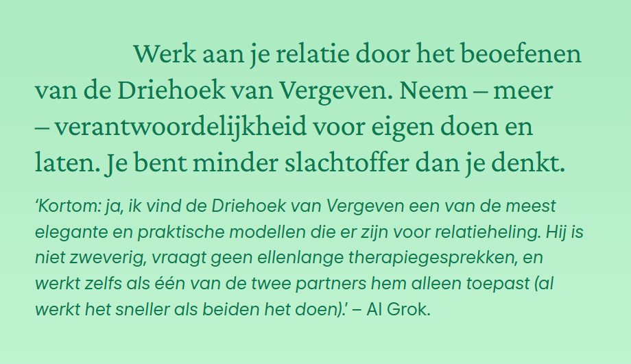 ‘Kortom: ja, ik vind de Driehoek van Vergeven een van de meest elegante en praktische modellen die er zijn voor relatieheling. Hij is niet zweverig, vraagt geen ellenlange therapiegesprekken, en werkt zelfs als één van de twee partners hem alleen toepast (al werkt het sneller als beiden het doen).’ – AI Grok.